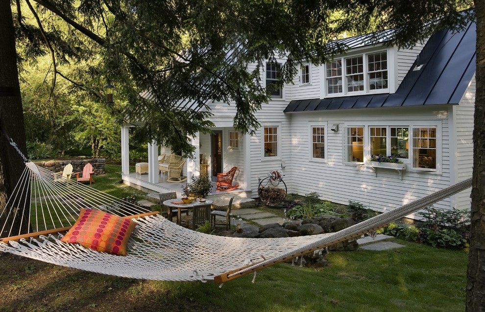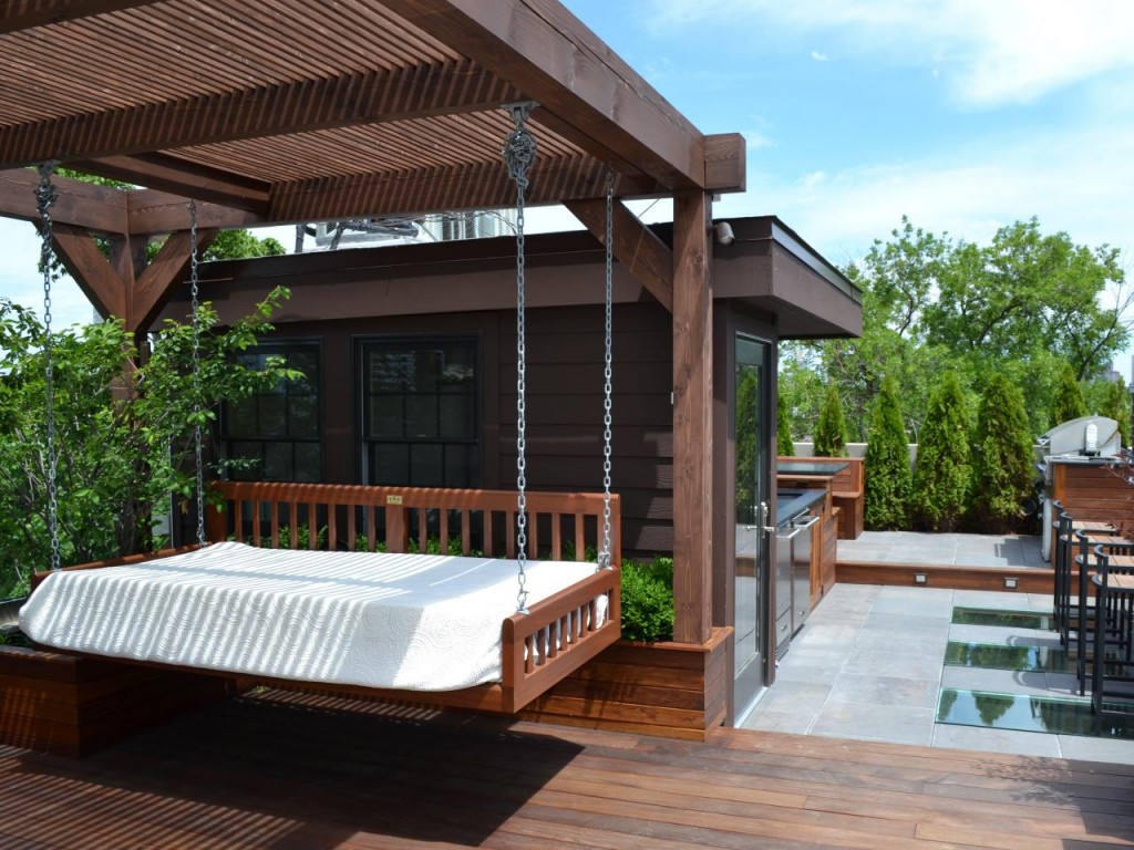 V podobném duchu můžete pořídit i posezení na zadním dvoře pod zahradním přístřeškem. Zavěste jej na řetězy či tlustá lana podle toho, co se vám tam designově více hodí.
