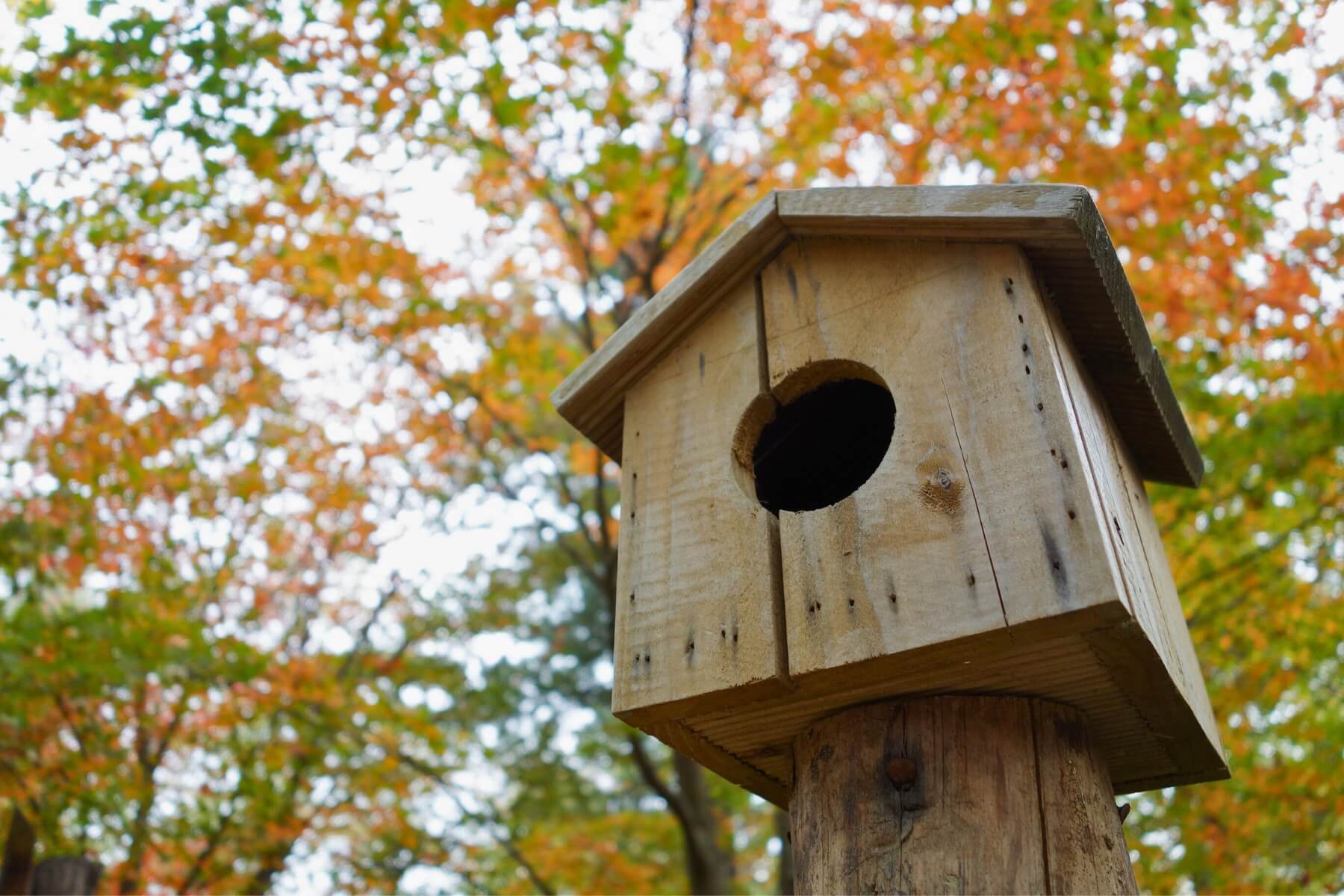 - Na strom: Ideální místo pro domek je na větvi stromu, alespoň 1,5 metru nad zemí a 2 metry od kmene. Ptáci tak budou mít dobrý rozhled a zároveň budou chráněni před predátory, jako jsou kočky či kuny.