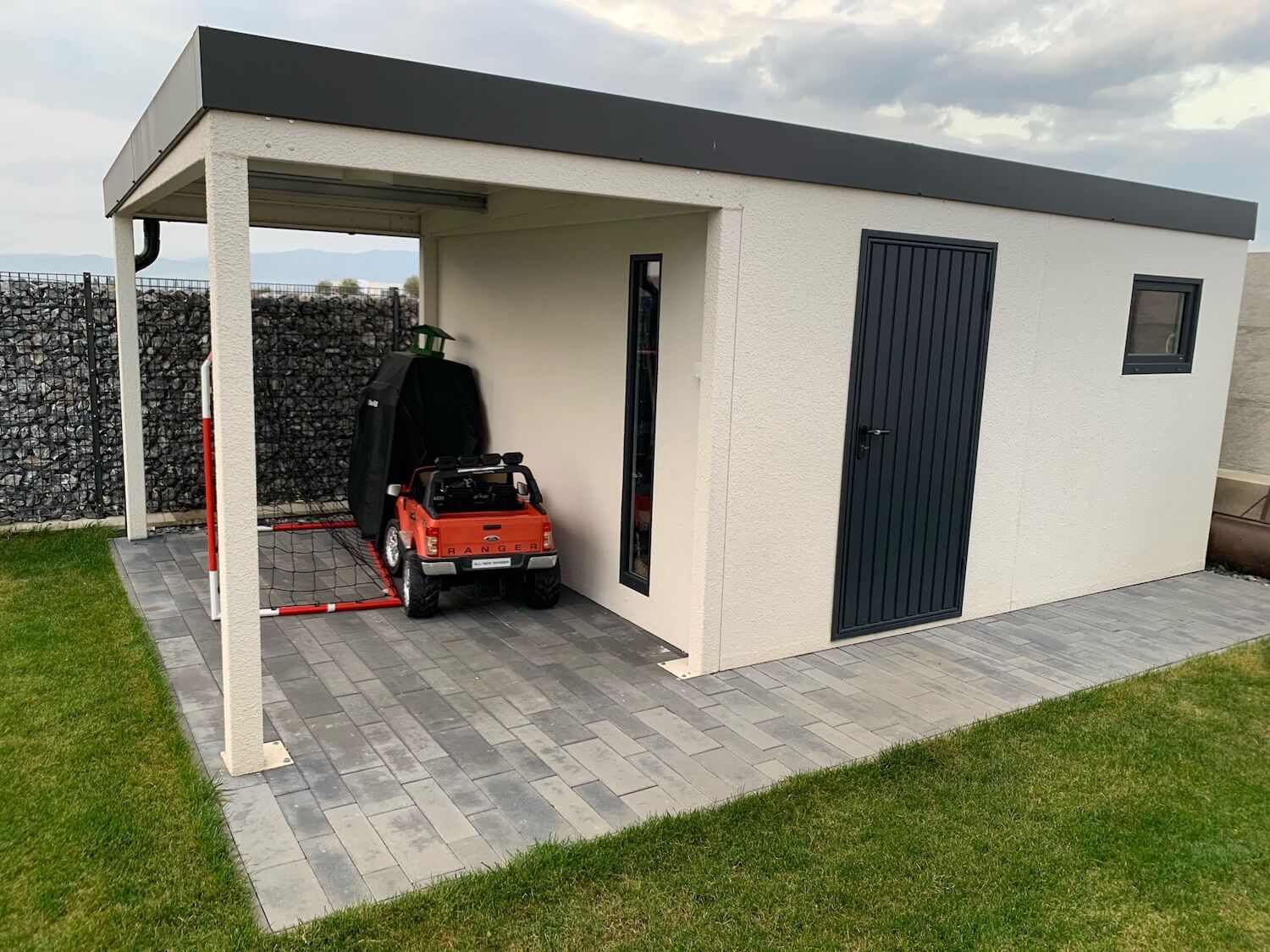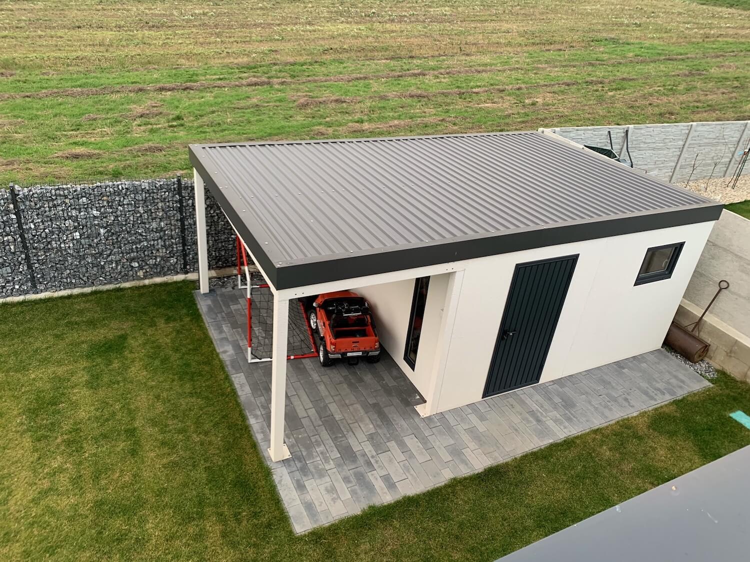 Pohľad zhora na záhradný domček s bráničkou a hracím autom pod prístreškom