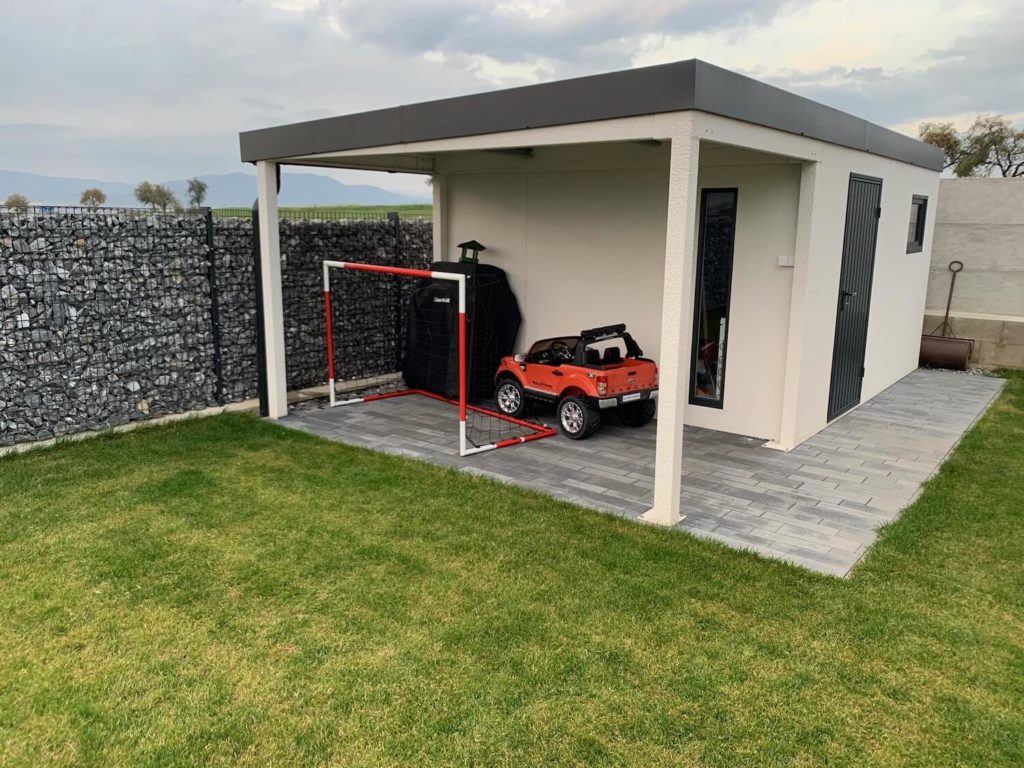 Záhradný domček s bráničkou a hracím autíčkom pod prístreškom na záhrade