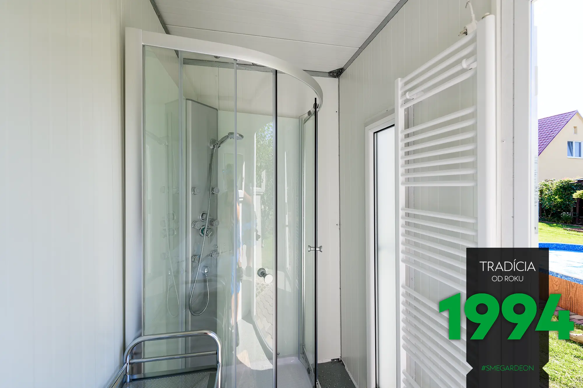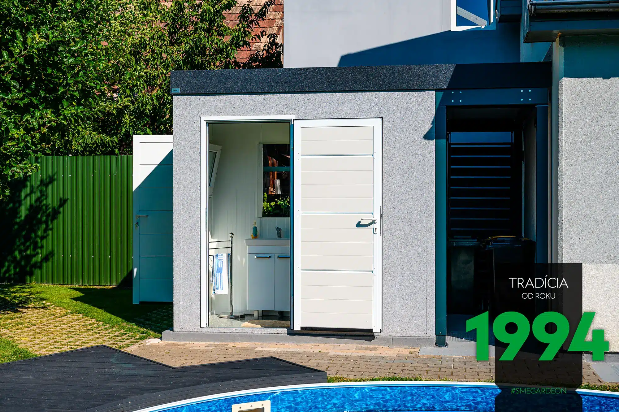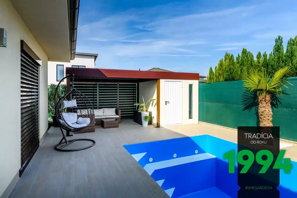 A v dostatečně prostorném zahradním domku, doplněném přístřeškem, si můžete vytvořit i dokonalé zázemí pro svůj bazén. Uvnitř domku můžete odložit vše, co byste neradi nosili dovnitř (například nafukovací kola a hračky, bez kterých se děti ve vodě neobejdou), a na lehátkách ve stínu pod přístřeškem si můžete odpočinout od příliš pálícího slunce.