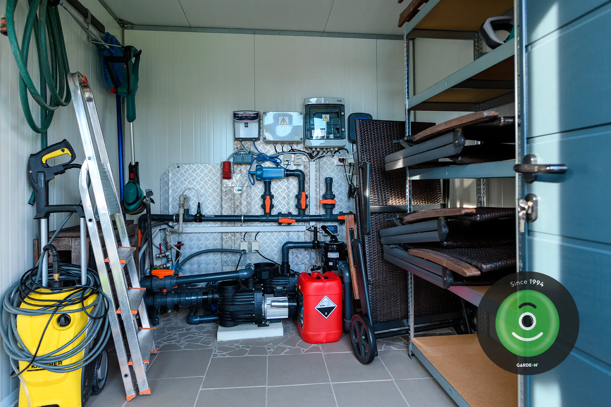 Systém na čištění vody v bazénu však není jedinou věcí, kterou budete potřebovat, abyste udrželi svůj bazén v dobré kondici a mohli se v něm co nejlépe koupat. I v tom má zahradní filtrační domek velkou výhodu – nemusí se jednat o jednoúčelový prostor. Je to také ideální místo pro uložení dalšího užitečného, ale objemného bazénového příslušenství – například bazénového vysavače nebo solární plachty, která v noci chrání vodu v bazénu před únikem tepla a přes den ji pomáhá ohřívat. Vše, co potřebujete pro svůj bazén, tak budete mít přehledně na jednom místě. Navíc zde můžete uzavřít, uzamknout nebo umístit mimo dosah dětí bazénovou chemii a veškerá nebezpečná zařízení.