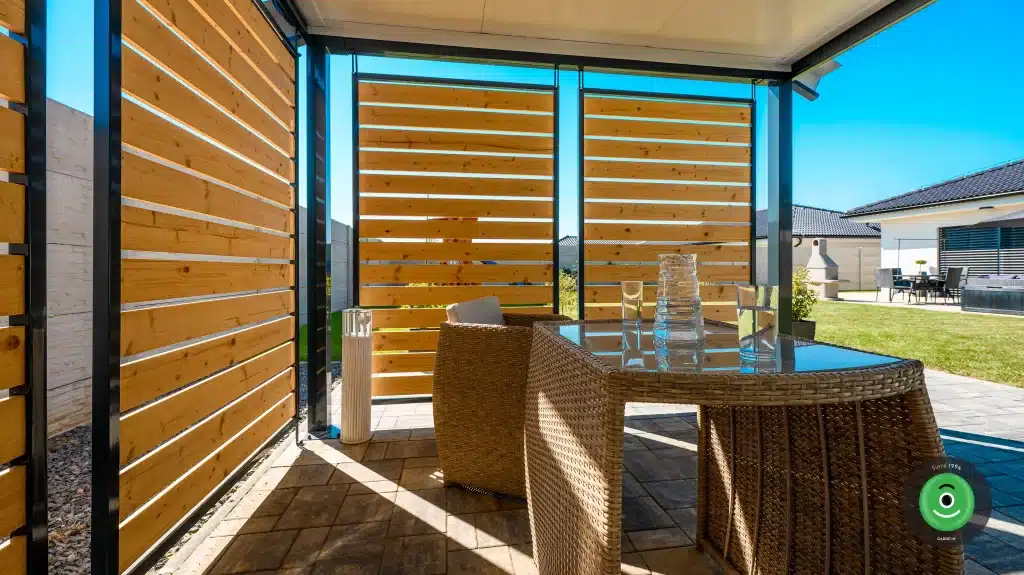 Stěnové panely, které se skládají z vodorovných lamel umístěných v nenápadném kovovém rámu, lze přidat k přístřeškům a pergolám GARDEON z libovolné strany (nebo stran). Jejich úkolem je především chránit vaše soukromí a pohodlí. Dokážou vás ochránit před nežádoucími pohledy z ulice nebo od sousedů, ale také před paprsky nízko položeného večerního nebo ranního slunce.