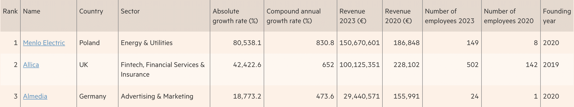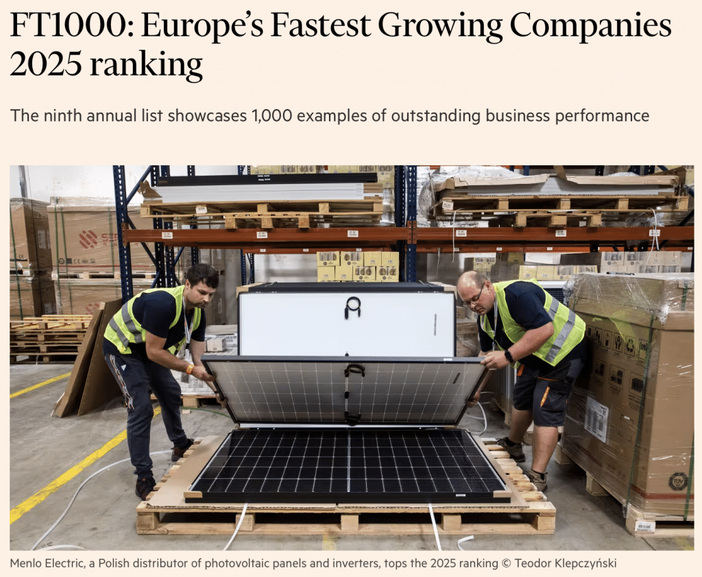 Žebříček za rok 2025 vede dodavatel fotovoltaických panelů Menlo Electric. Na druhé příčce se umístila Allica, britská bankovní platforma a třetí pozici obsadila německá reklamní a marketingová platforma Almedia. V roce 2025 se v top tisíci evropských firem umístily pouze dvě slovenské, přičemž naše rodinná firma Gardeon byla jednou z nich.