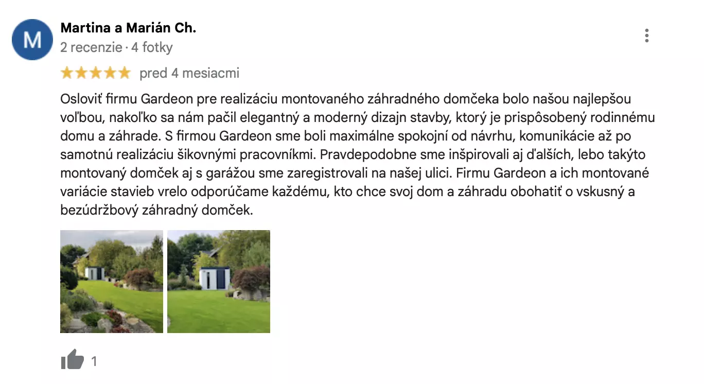,,Váš zahradní domek se skvěle doplňuje se stylem našeho domu, působí vkusně a splňuje náš požadavek na snadnou údržbu. Montážní pracovníci byli u nás tři. Byli velmi slušní, milí a opravdu velmi zruční. S výsledkem jsme nadmíru spokojeni.“