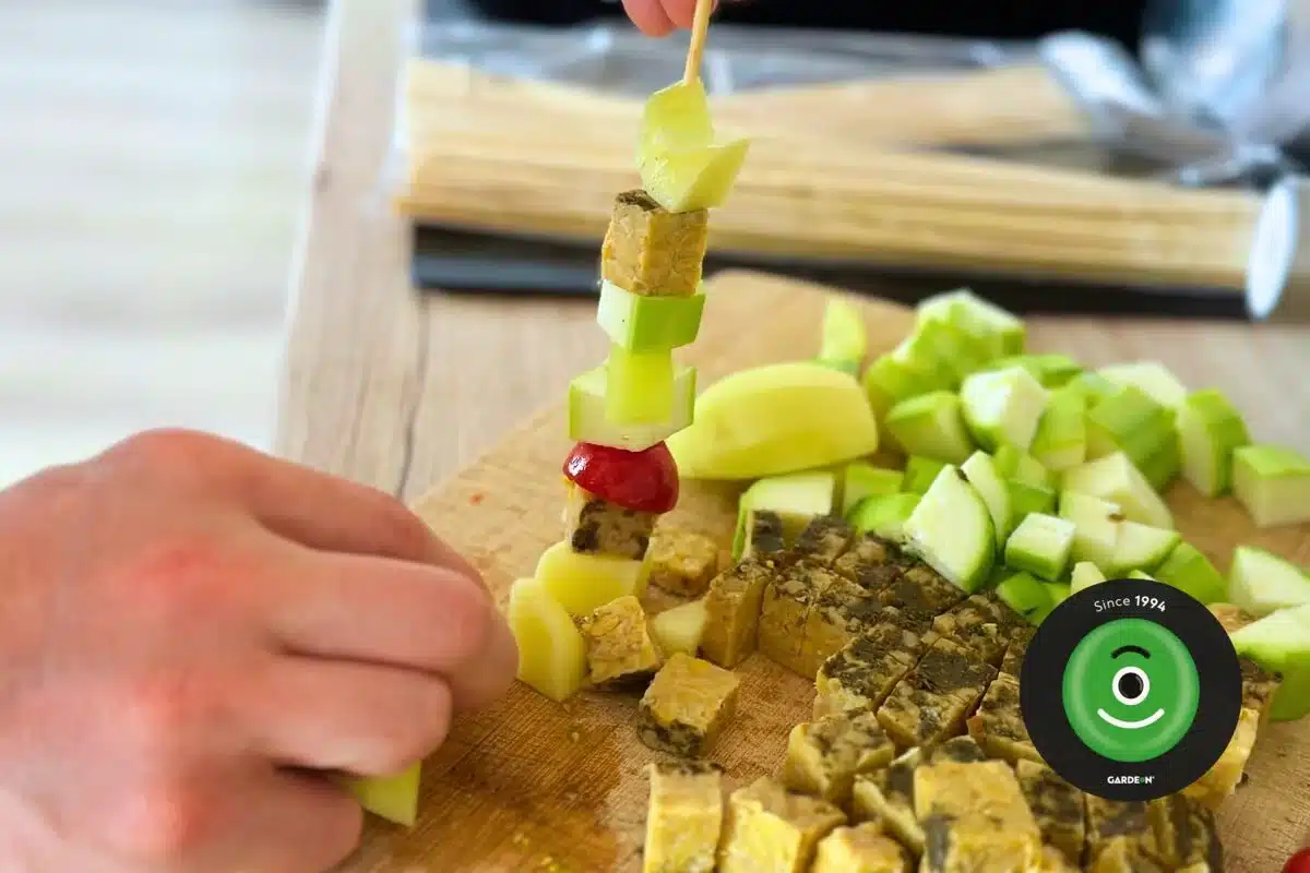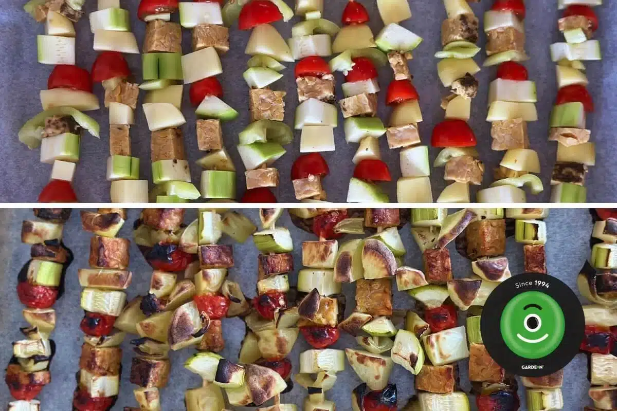 Mix zeleniny, tofu a tempehu napíchaný na špízy a marinovaný v sójové omáčce s medem a česnekem. Grilujte na střední teplotě, dokud není vše pěkně ugrilováno.