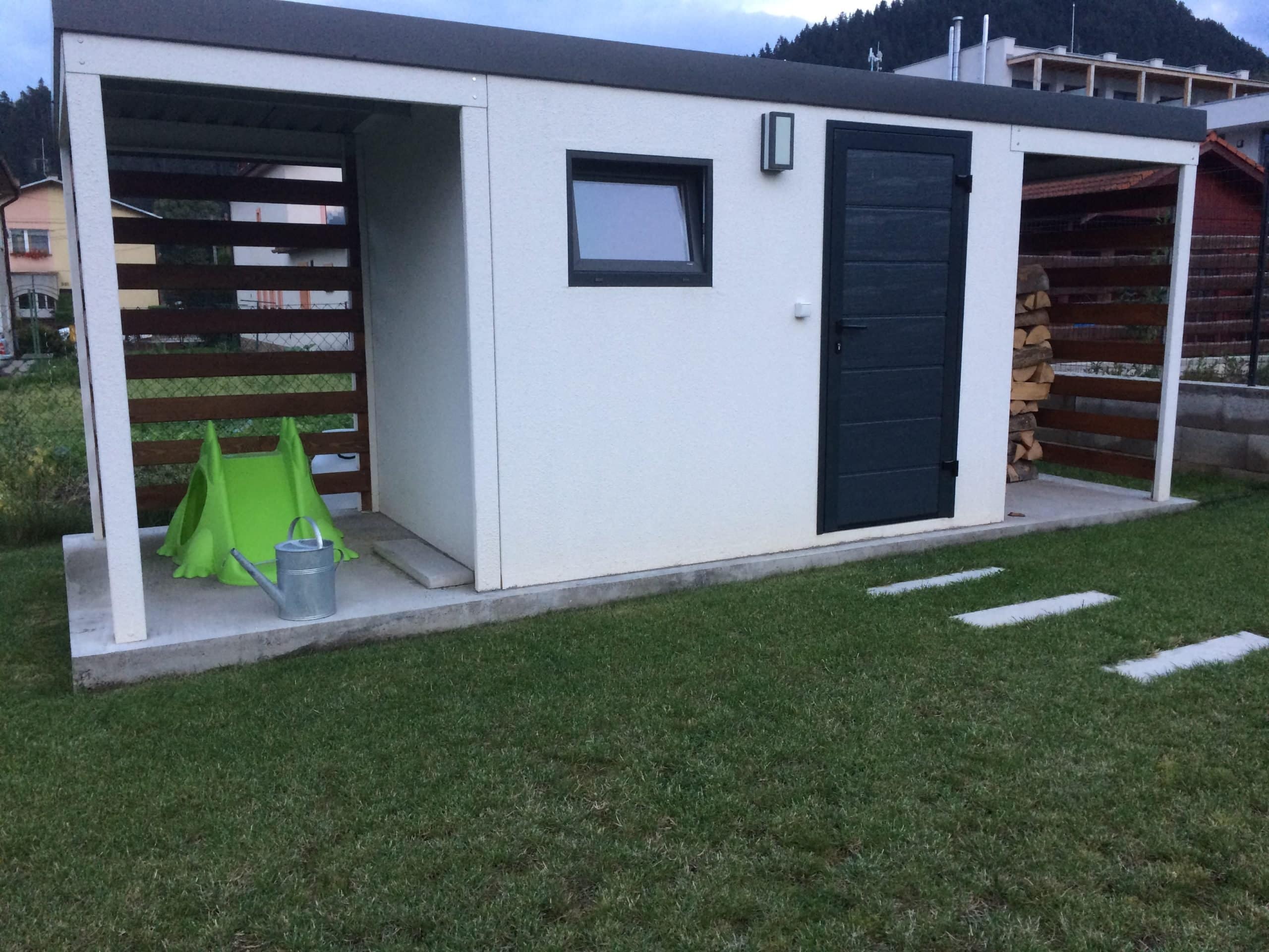 Paní Bobčáková si v září na naší stránce našla konfigurátor na zahradní domek, který ji velmi zaujal. Po vzájemné konzultaci jsme pak na levou a pravou stranu přidali i přístřešky (např. na posezení, uskladnění dřeva).