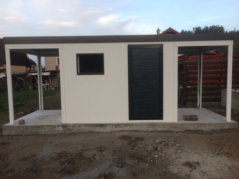 - rozměr zahradního domku – 2 900 x 2 100 mm + přístřešek (dva přístřešky na levé a pravé straně) – 1 500 x 2 100 mm