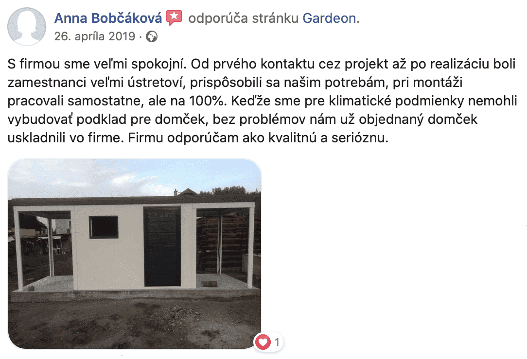 „Se zahradním domkem jsme velmi spokojeni. Doplňuje naši zahradu. Je v něm dostatek místa pro uložení zahradních potřeb a sezónních věcí. Máme tam také stůl a elektrický vařič na zavařování. Ve vnějších výklencích je dost místa na uložení dřeva do krbu. Anka„