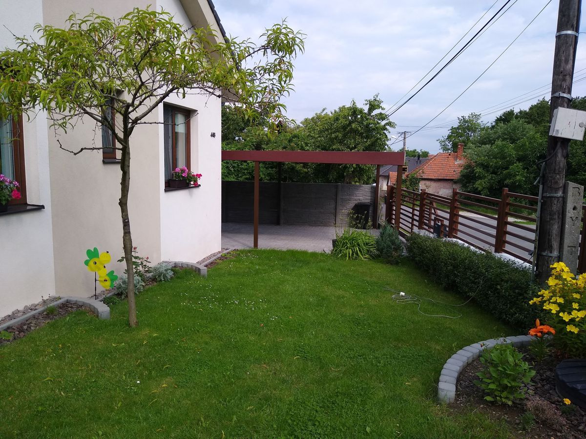 Pan Pavličko nás v dubnu oslovil emailem s tím, že by měl zájem o zahradní domek s přístřeškem. Narazil na nás na internetu. V začátcích naší komunikace měl jasno už i v tom, jaký podklad pod montovaný domek připravit – vybral si zámkovou dlažbu.V průběhu komunikace jsme poupravili barvu omítky a doplňků, aby domeček co nejvíce ladil s domem. Pan Pavličko s objednávkou dlouho neváhal a tak jsme pro něj montovali už v červenci téhož roku. Byl s námi tak spokojený, že nás znovu oslovil v březnu následujícího roku a objednal si i přístřešek pro auto.