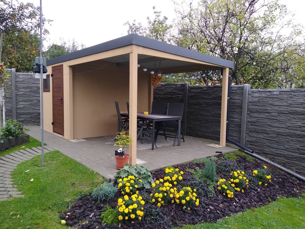 - rozměr zahradního domku – 2 500 x 2 980 mm + přístřešek 3 000 x 2 980 mm + antikondenzační systém DRIPSTOP