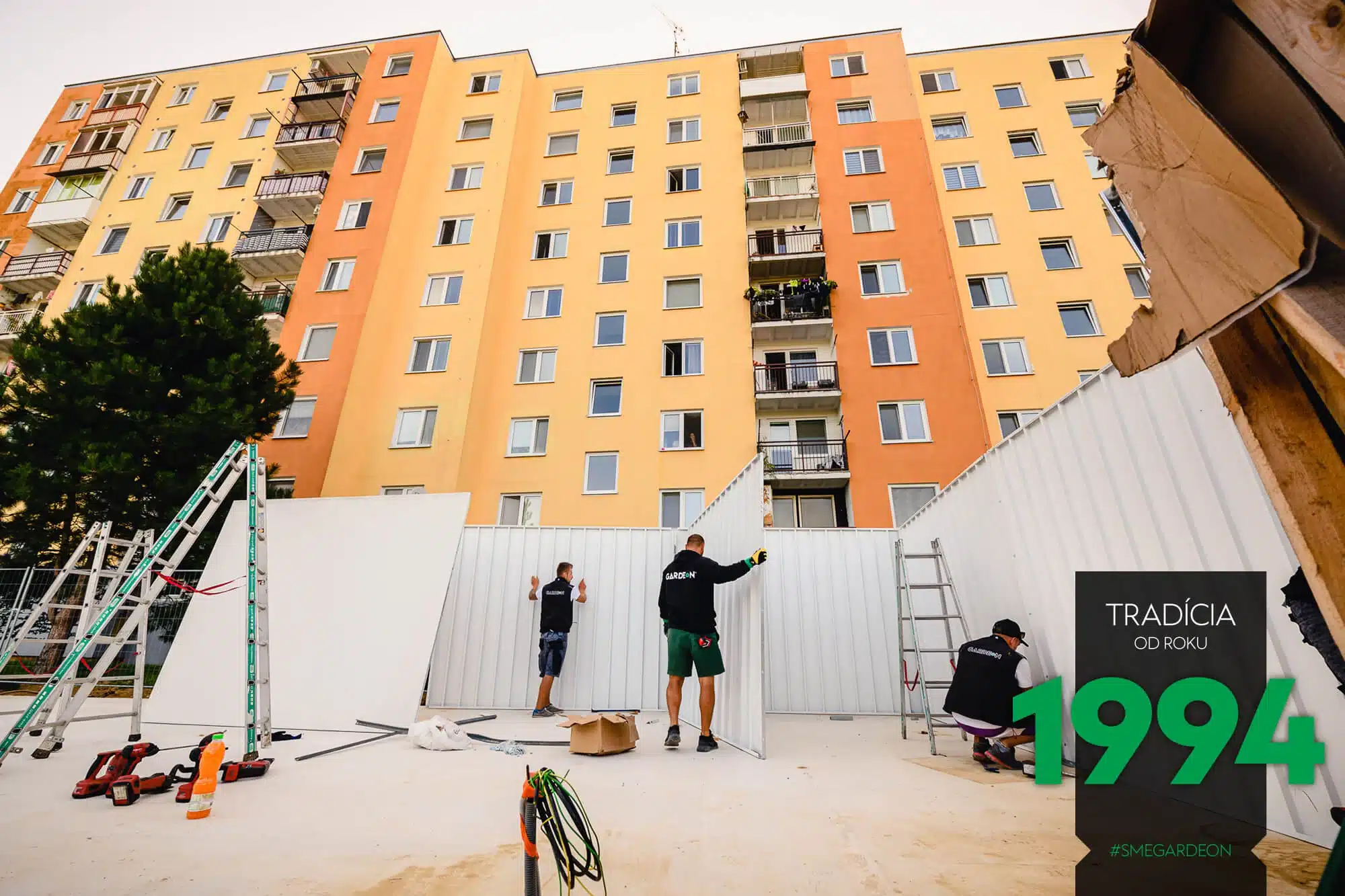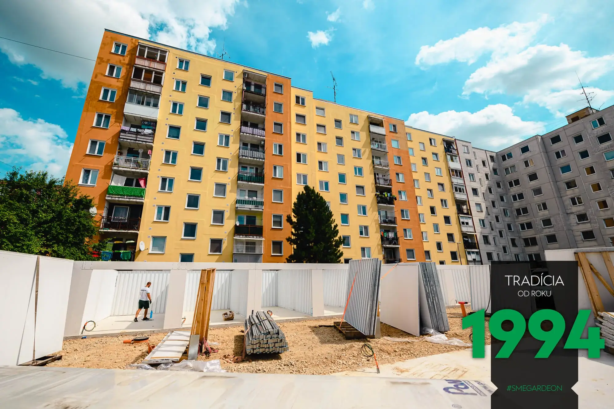 První večer stojí stěny garáží pevně na svém místě, ráno se bude v práci pokračovat.