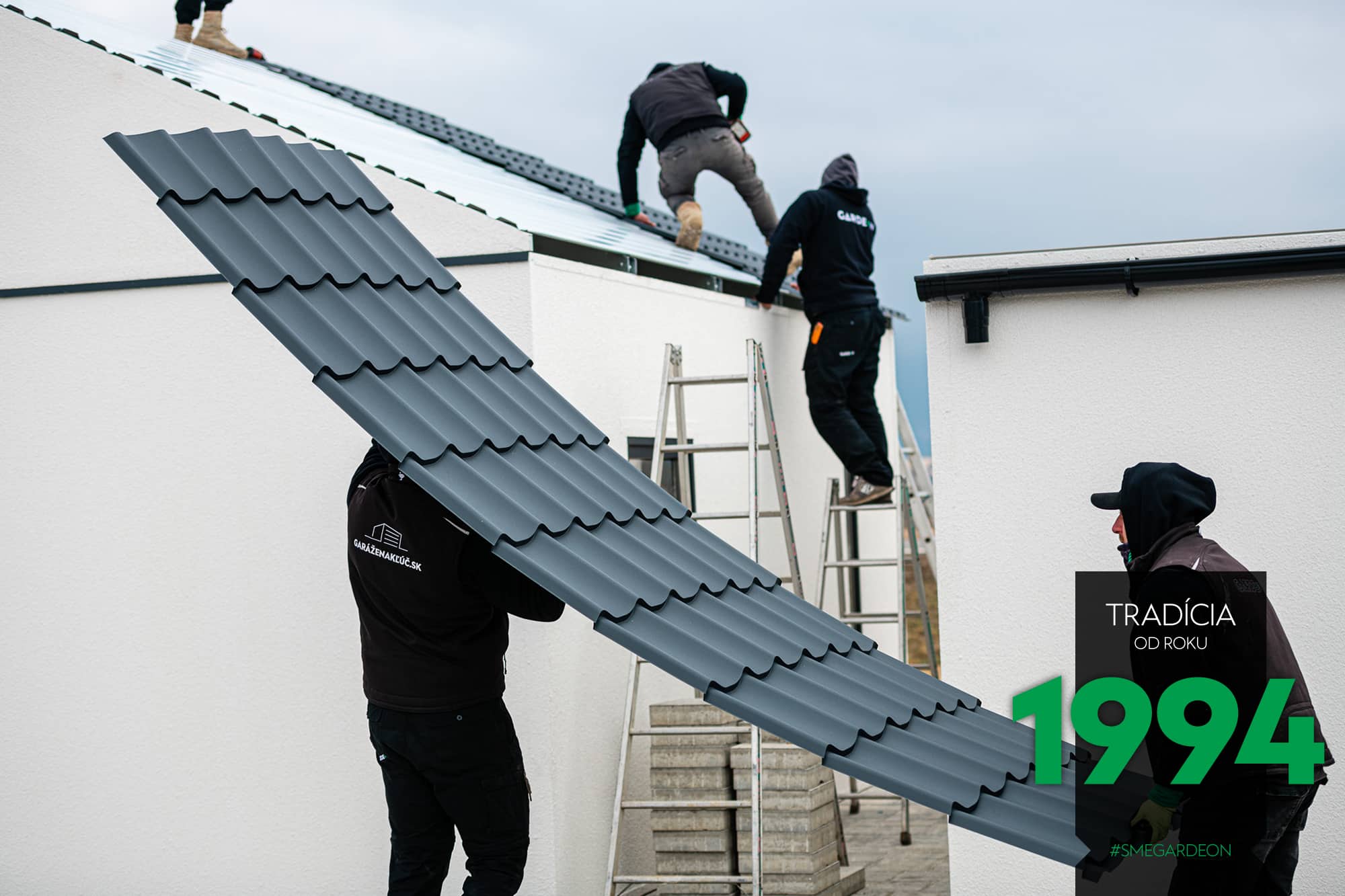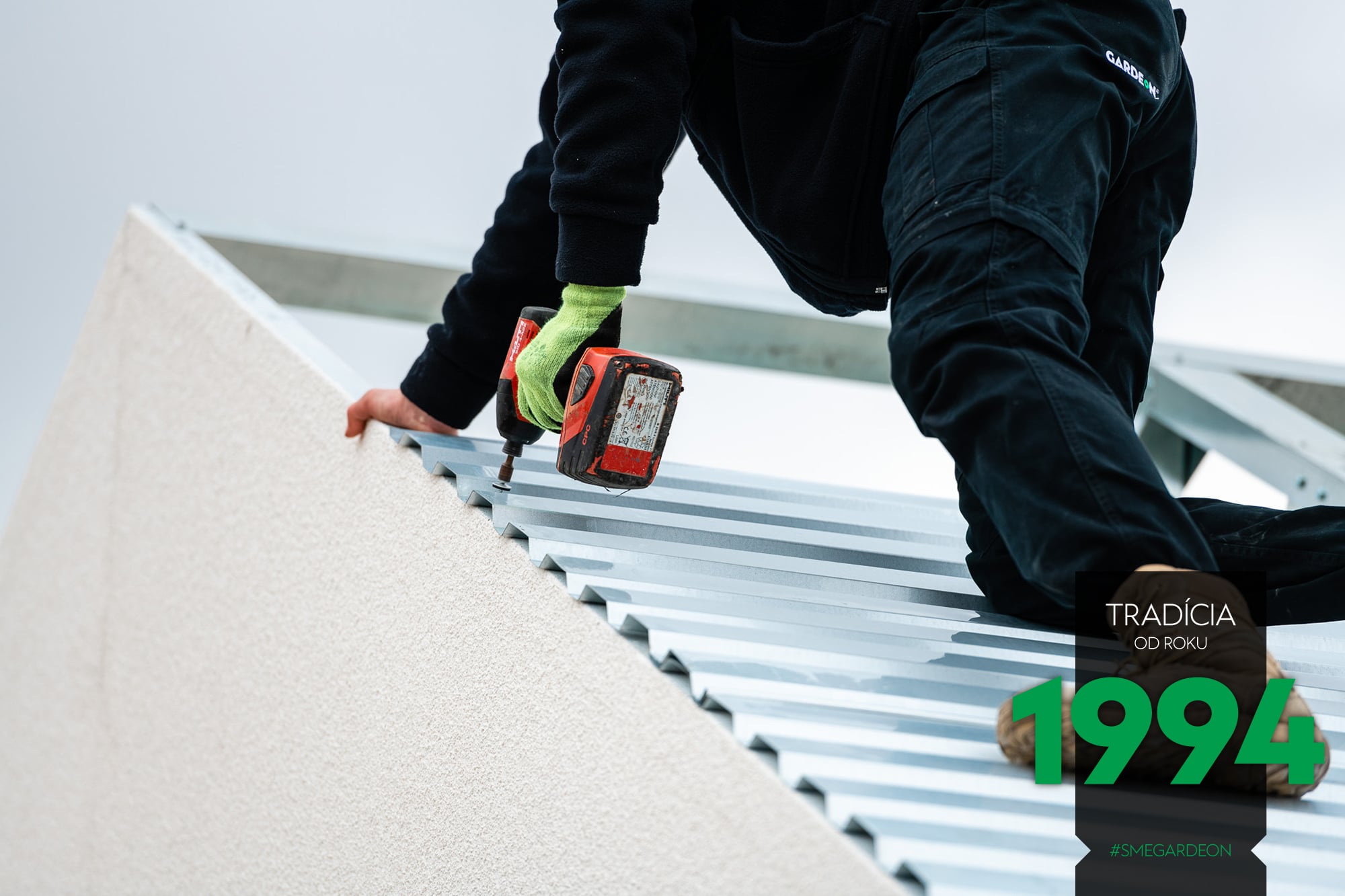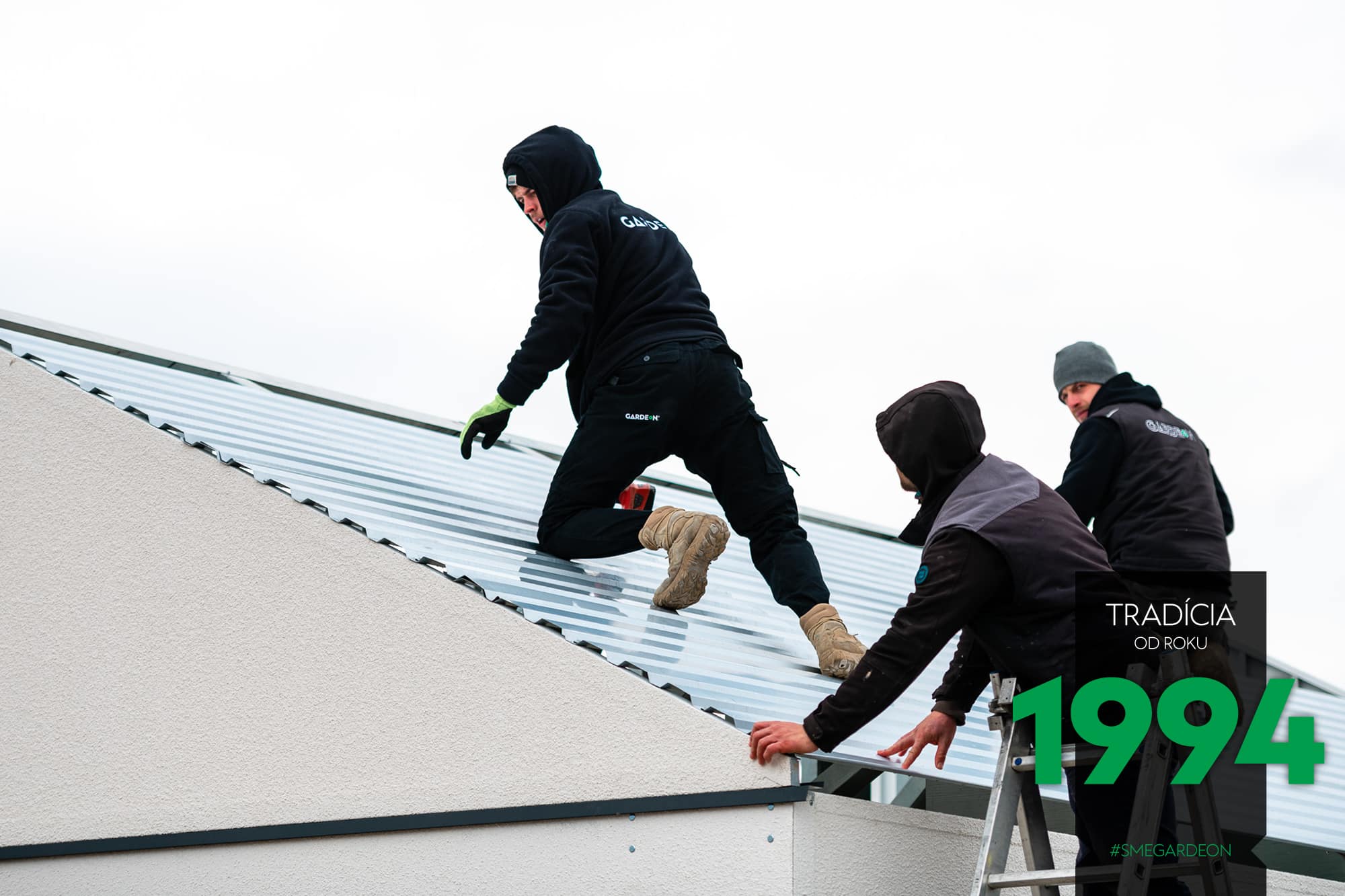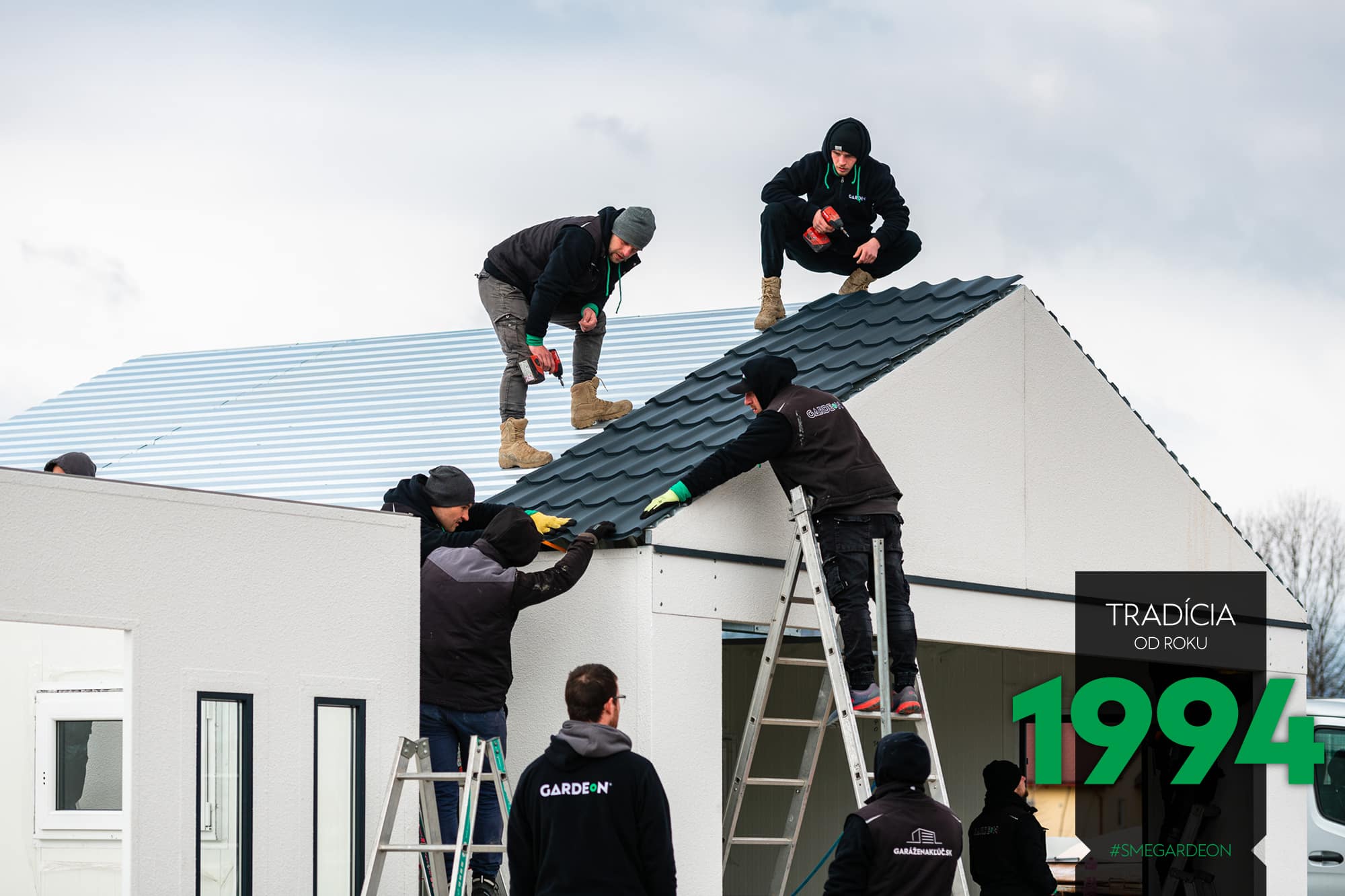 Dalším krokem je montáž střešní krytiny. Aby se zajistila maximální odolnost proti povětrnostním vlivům, špičaté střechy garáží GARDEON mají dvouplášťovou plechovou krytinu.