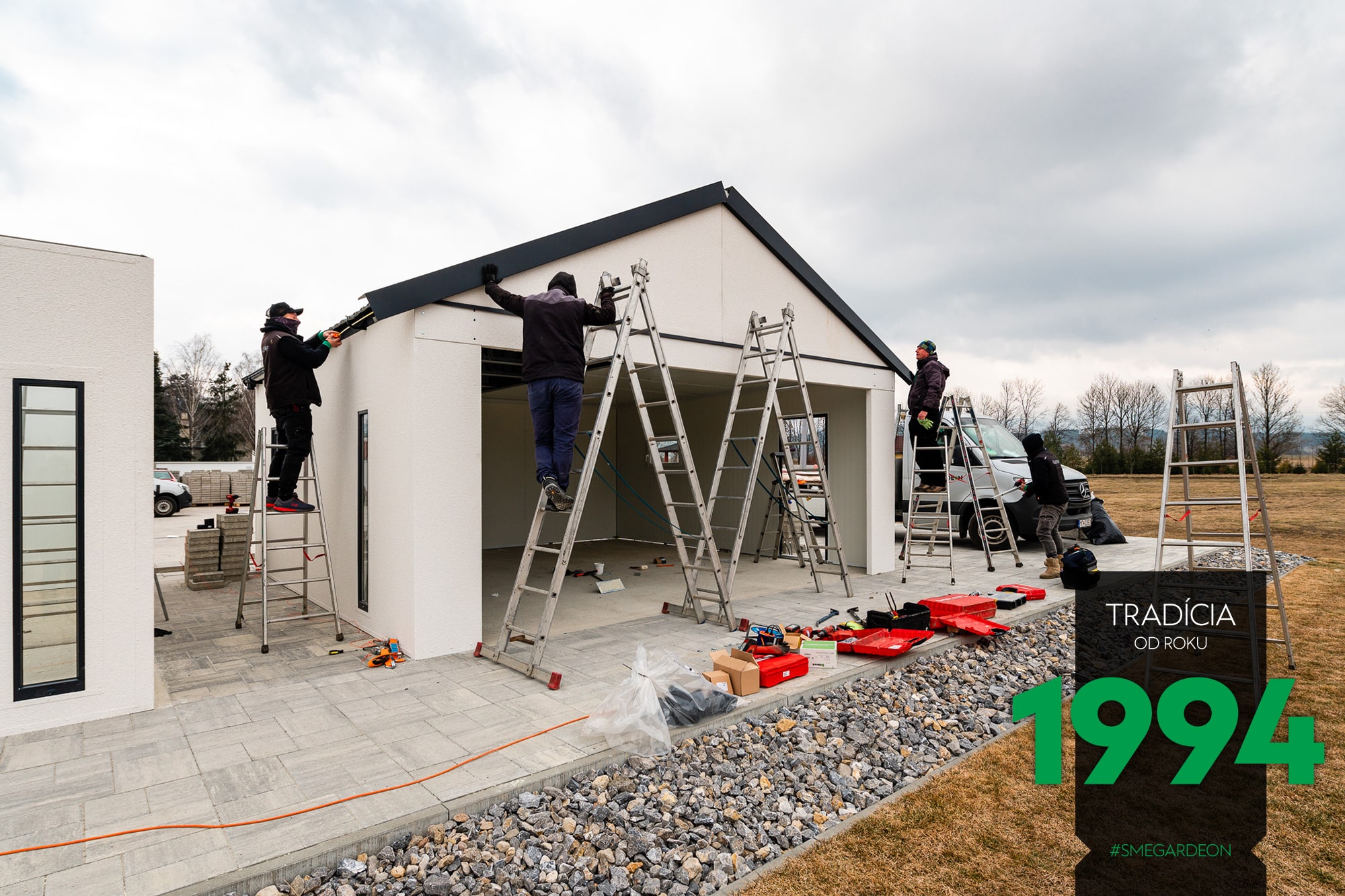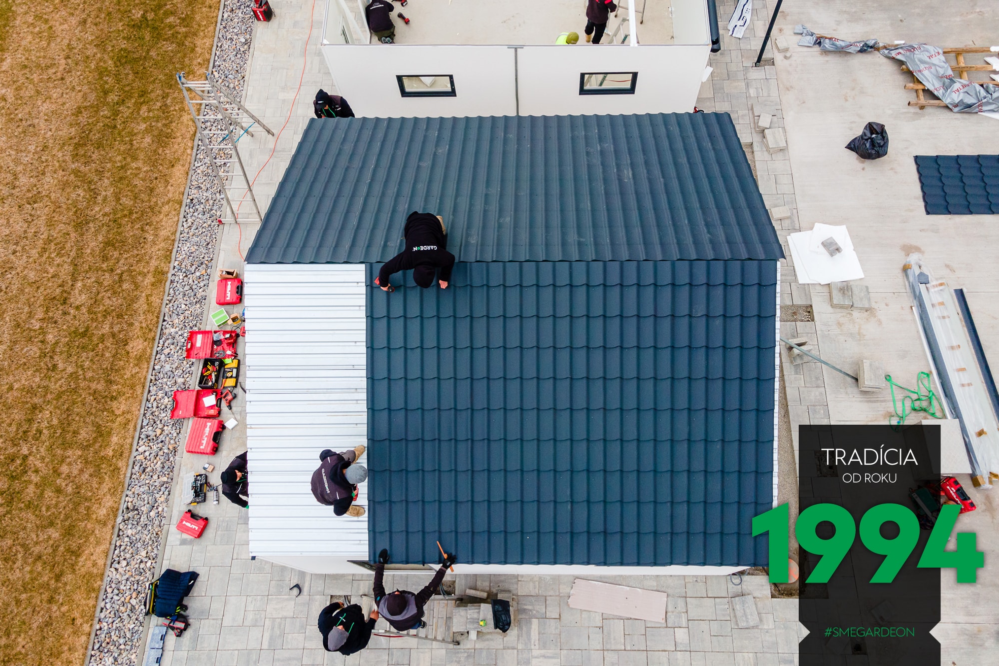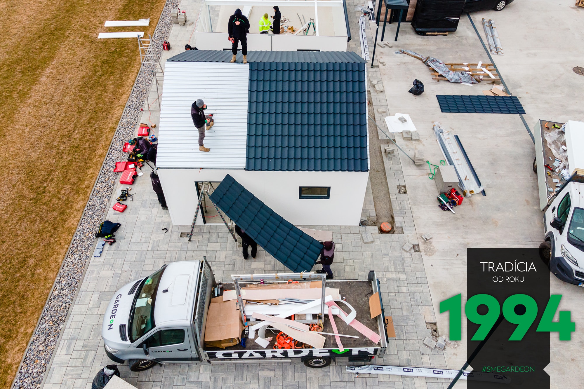 Dalším krokem je montáž střešní krytiny. Aby se zajistila maximální odolnost proti povětrnostním vlivům, špičaté střechy garáží GARDEON mají dvouplášťovou plechovou krytinu.