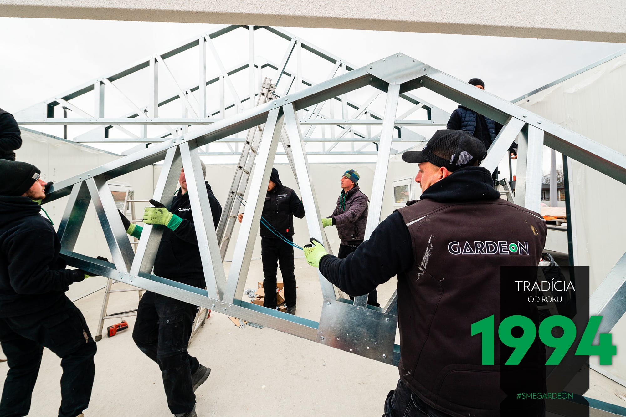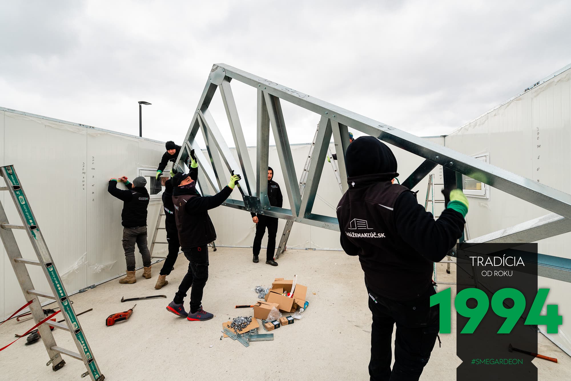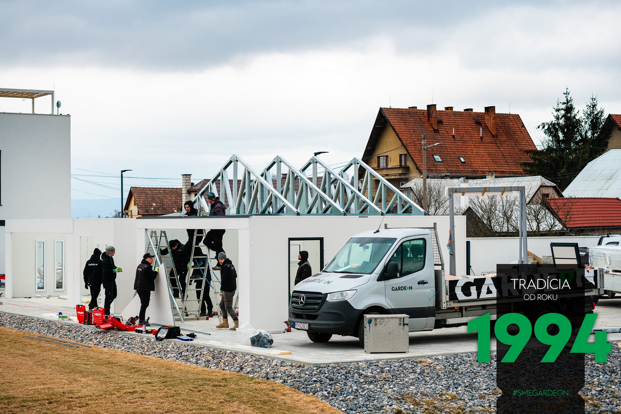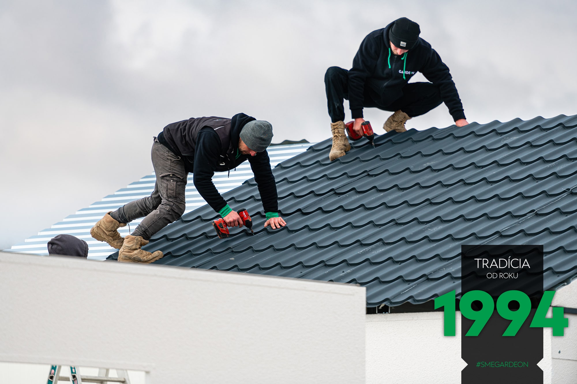 Dalším krokem je montáž střešní krytiny. Aby se zajistila maximální odolnost proti povětrnostním vlivům, špičaté střechy garáží GARDEON mají dvouplášťovou plechovou krytinu.