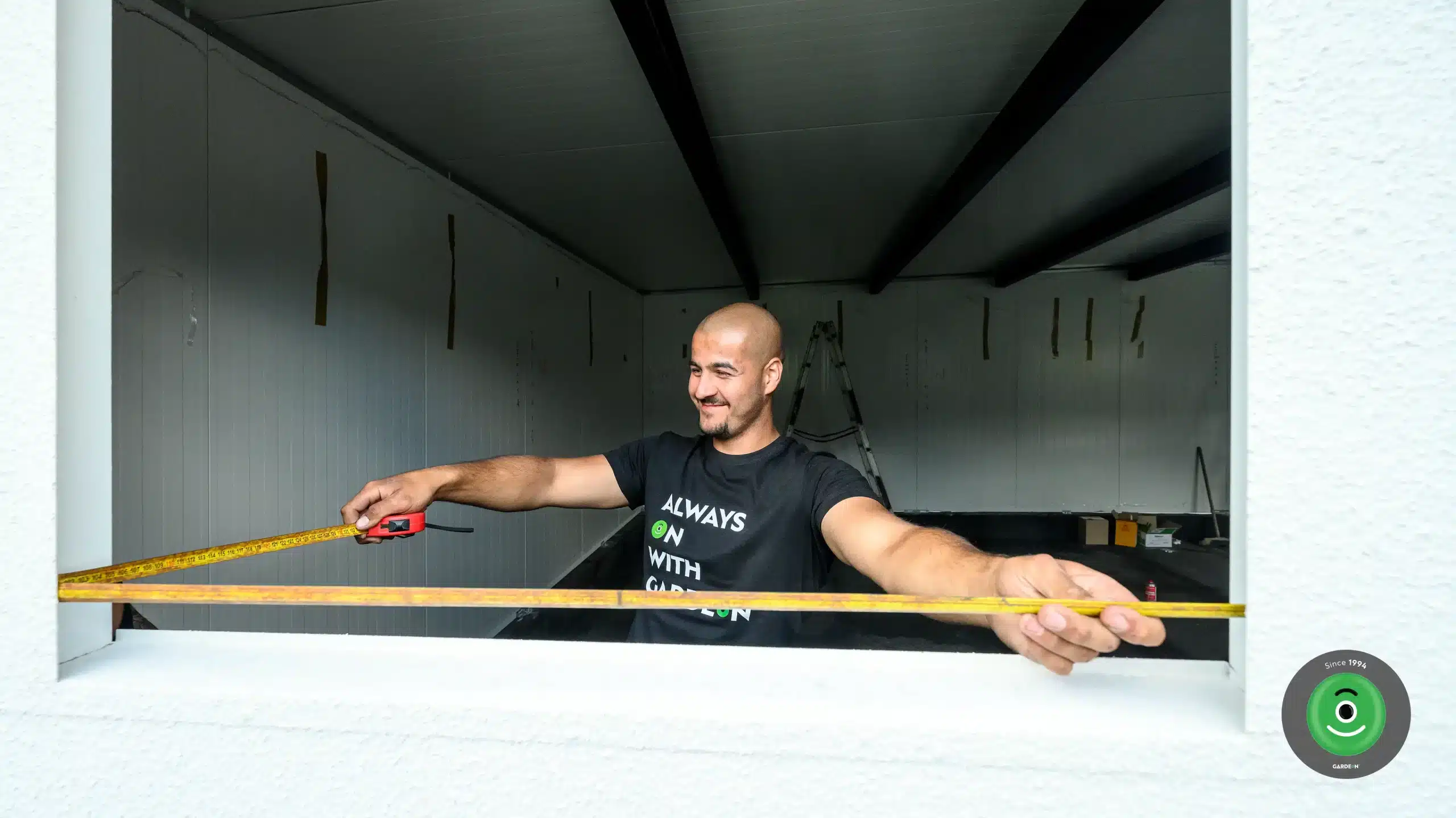 Následuje kontrola přesnosti osazení – naši montážníci důkladně přeměří, zda jsou všude náležité úhlopříčky a tím pádem i pravé úhly. Když je vše na správném místě, stěnové panely se ukotví k podkladu.
