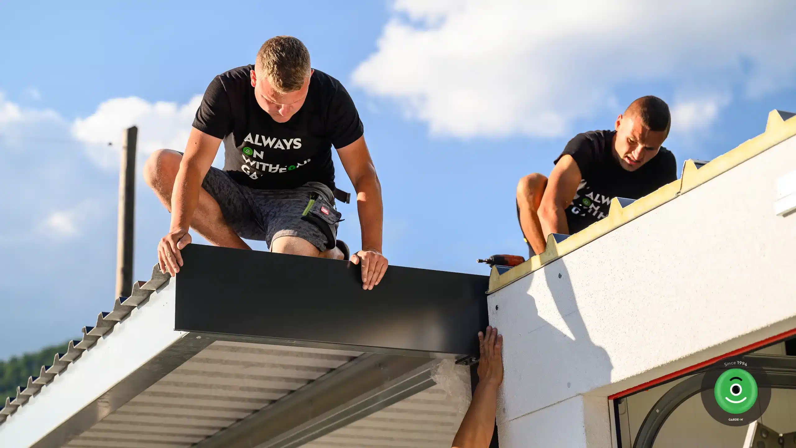 Jdeme do finále. Po namontování elegantní atiky, která začistí a ochrání okraje střešní krytiny, se ještě doladí poslední detaily, garáž je hotová.