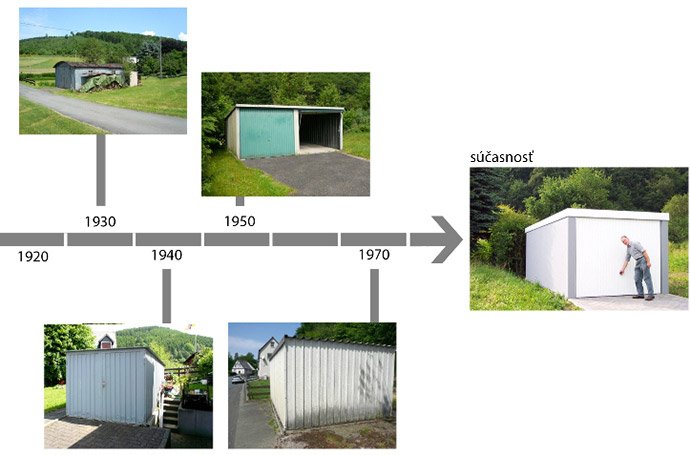 Dějiny ocelových garáží v Německu sahají na začátek třicátých let minulého století. Vzhledem k tomu, že vozidla byla a i jsou drahé záležitosti, majitel je chtěl přirozeně vidět dobře umístěné v garáži. Nejjednodušší dostupný materiál pro garáže s nejlepším poměrem nákladů a výnosů v užívání byla ocel. A tak vznikly první, tzv. garáže z vlnitého plechu s jejich typickým vnějším vzhledem, obloukovou střechou a křídlovými dveřmi.