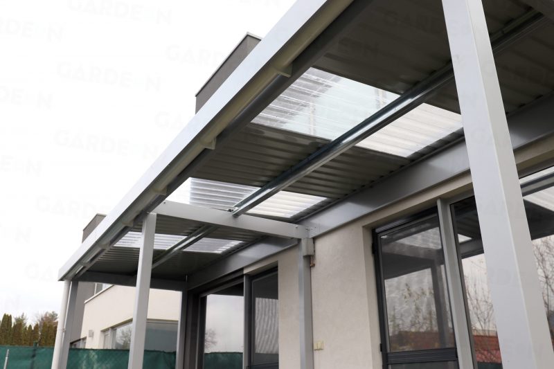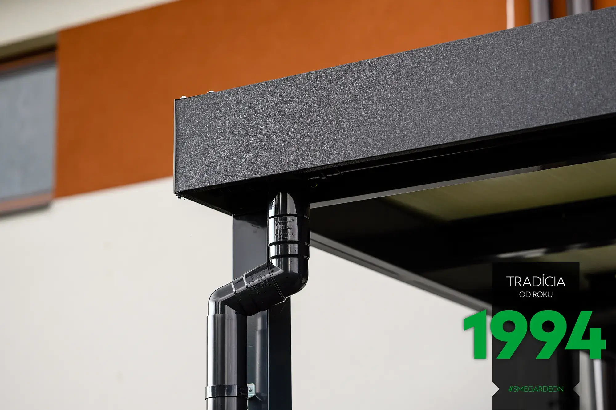 Praktické vlastnosti montovaných pergol rozšiřují také různé varianty zastřešení. Vedle ploché střechy s permanentní konstrukcí z ocelových nosníků a střešní krytinou z trapézového plechu, vám nabízíme i standardní krytinu s povrchovou úpravou DRIPSTOP.