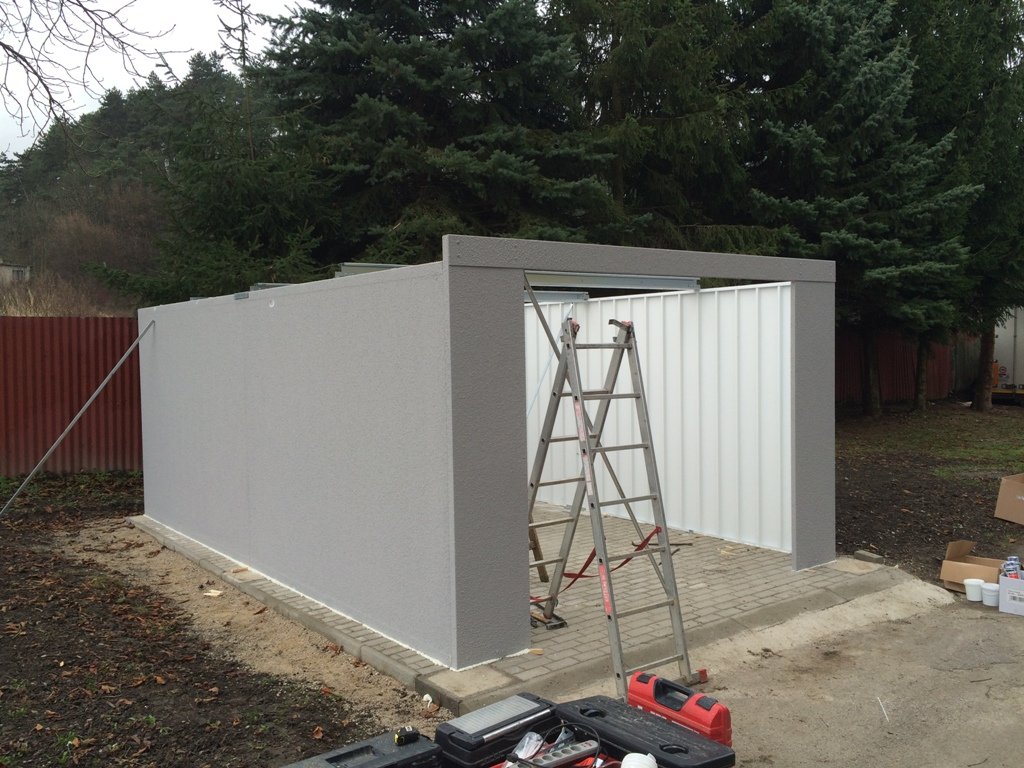 Teraz na miejscu jest już gotowy garaż. Dla bardziej wymagających użytkowników oferowane są ulepszenia garażu modułowego za pomocą dodatków designerskich – kolorowych alternatyw rynien, drzwi, okien czy nawet nowoczesnych świetlików. Jeśli zastanawiają się Państwo, kiedy przychodzi kolej na tynk, odpowiedź jest prosta. Garaże modułowe dostarczane są z gotowym tynkiem bezpośrednio z produkcji.