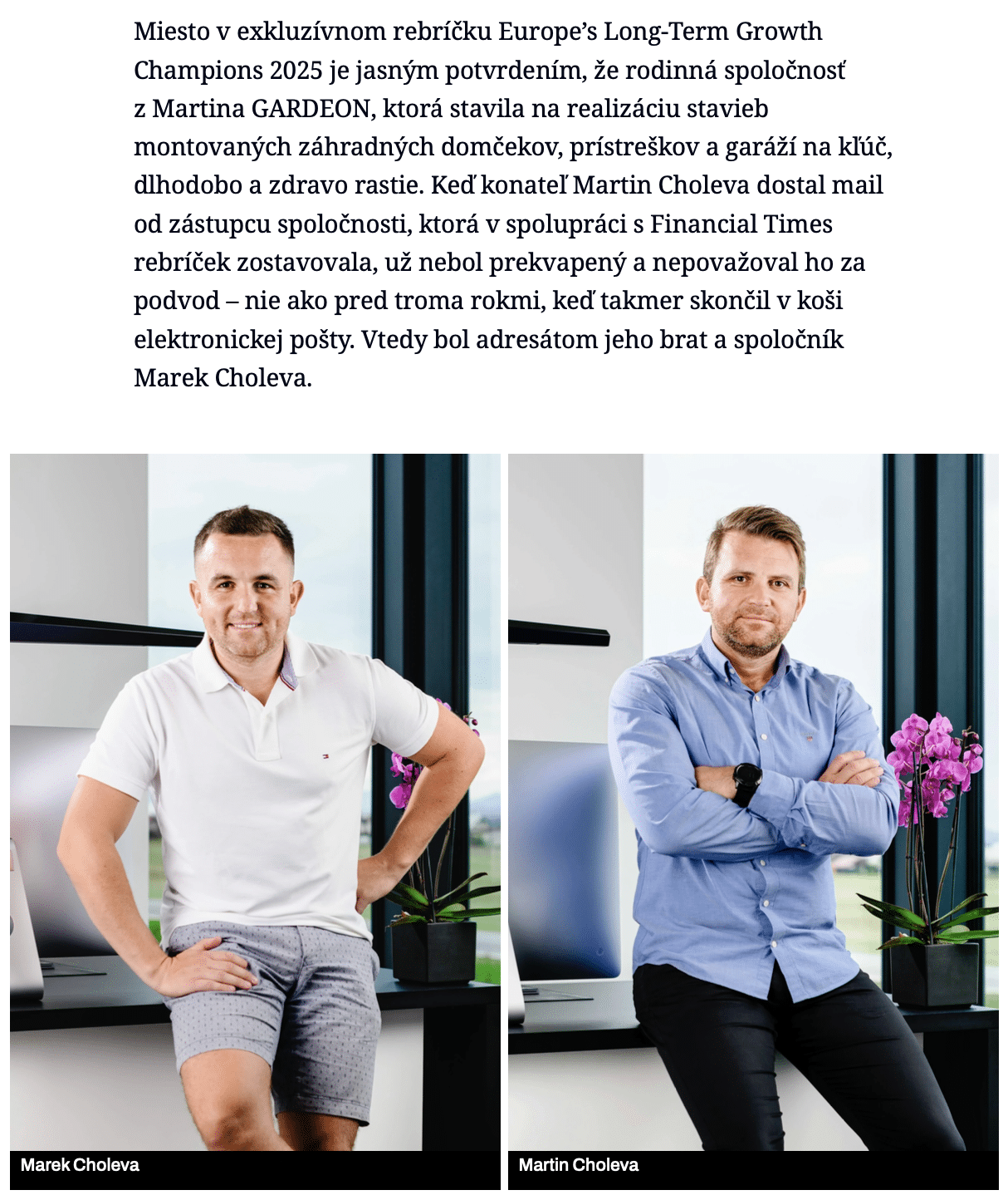 Niedawno osiągnęliśmy kolejny kamień milowy w historii naszej firmy Gardeon – znaleźliśmy się wśród 300 najlepszych europejskich firm o długoterminowym wzroście. Zajęliśmy nawet 46. miejsce, co jest niesamowitym sukcesem, a udało nam się to jako jedynej firmie ze Słowacji.