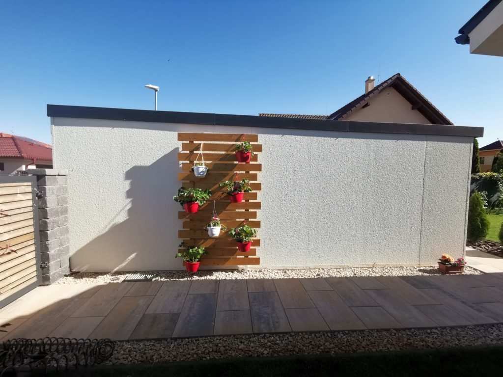 Chcieliby Państwo ożywić prostą ścianę boczną garażu lub domku ogrodowego? Proszę spróbować wykorzystać do tego wiszące doniczki – mogą się Państwo zainspirować na przykład tym dobrym pomysłem od naszego klienta, pana Takásca z Šali.