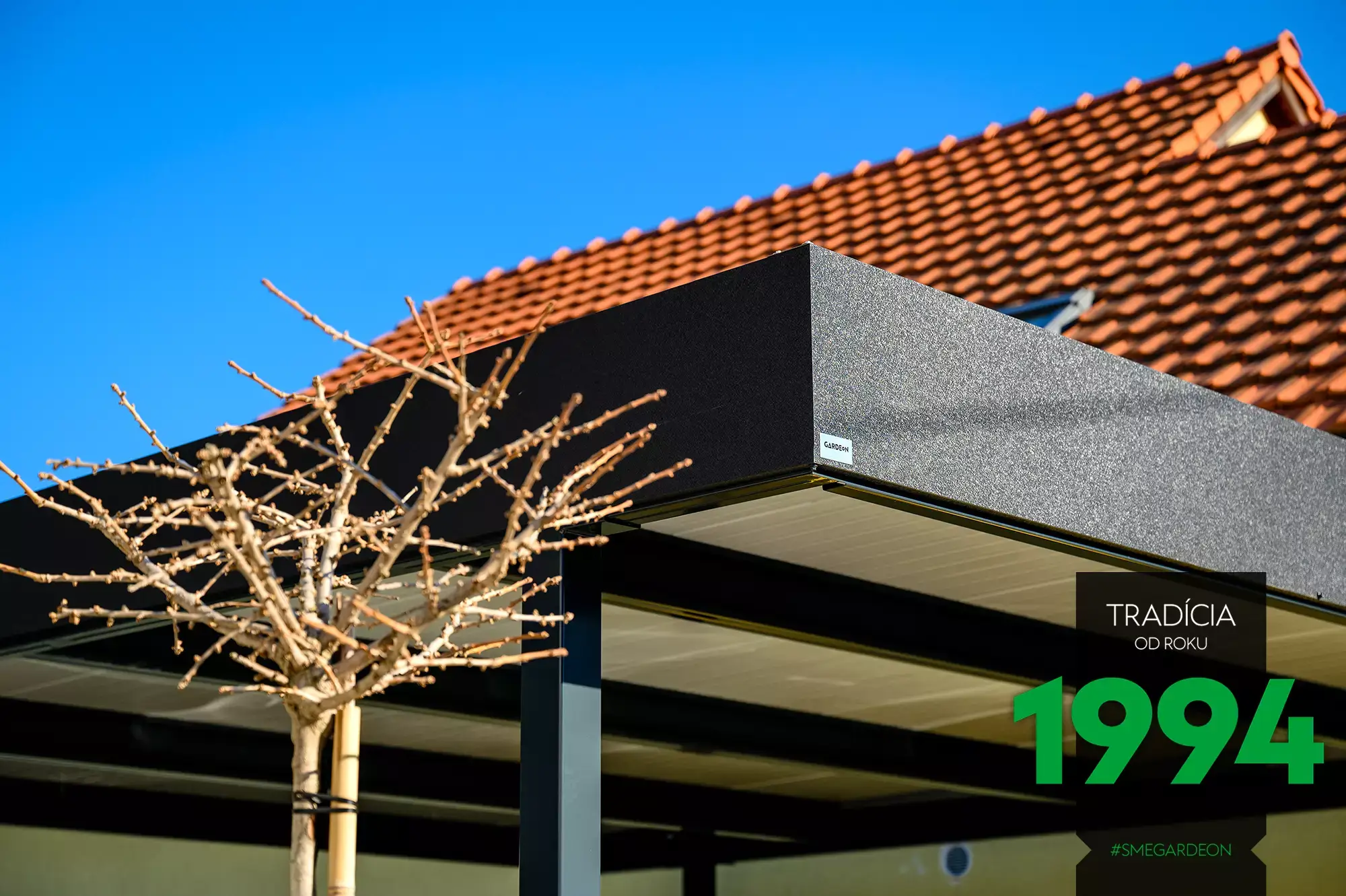 Výplně přístřešků GARDEON tvoří trendové vodorovné kovové laťování ve čtyřech barevných provedeních (bílá, hnědá, antracitová, bílý hliník). Přístřešek tak lze pěkně sladit například s obložením fasády domu.