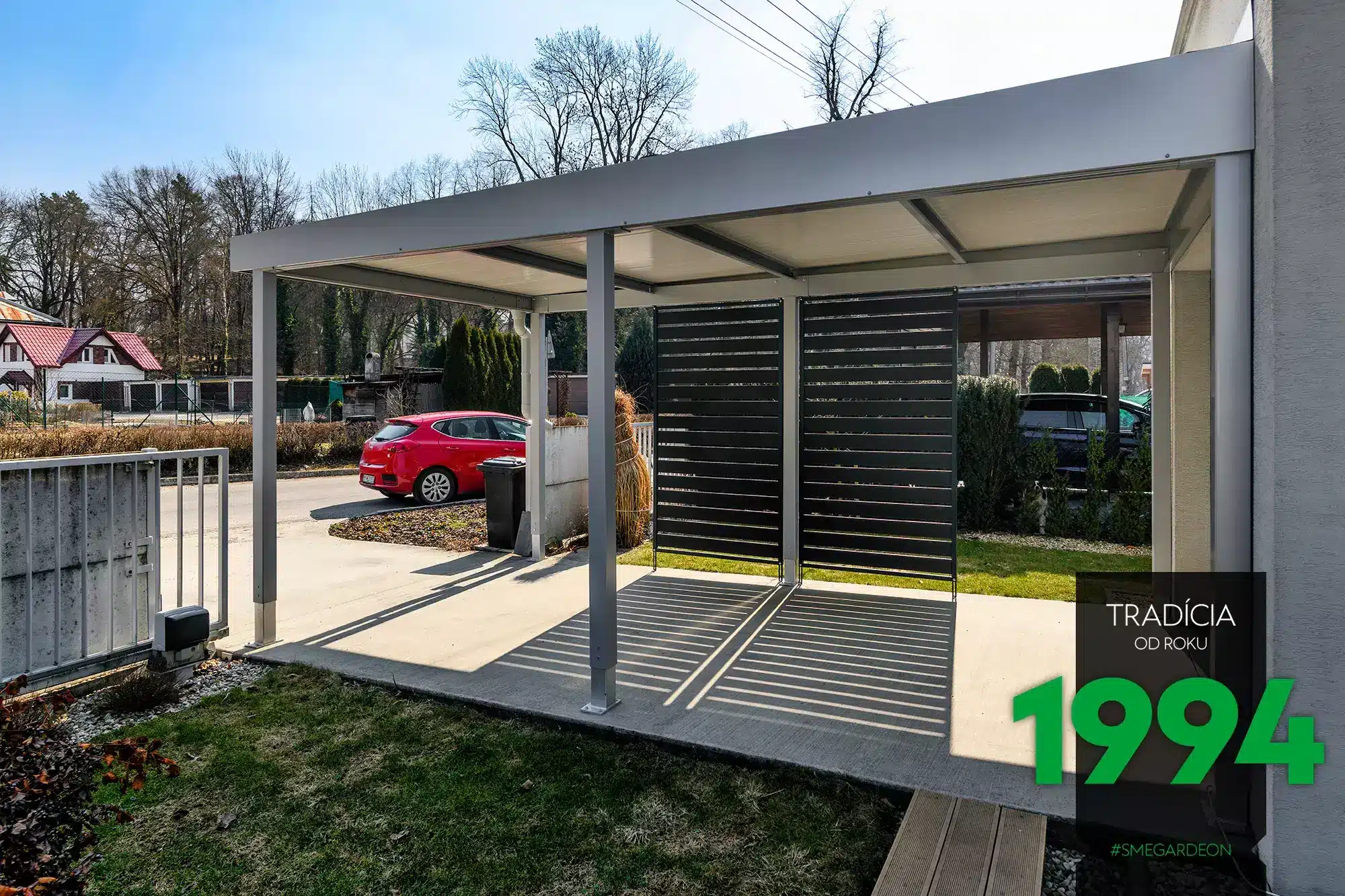 V naší nabídce najdete přístřešky – GARDEON. Mají montovanou konstrukci z kvalitní oceli. Informace o všech kombinacích typizovaných rozměrů najdete na podstránce, nebo v příslušném inteligentním konfigurátoru. Vyberte si velikost, jaká vám vyhovuje, a po vyplnění údajů vám v krátkém čase zašleme cenovou nabídku.
