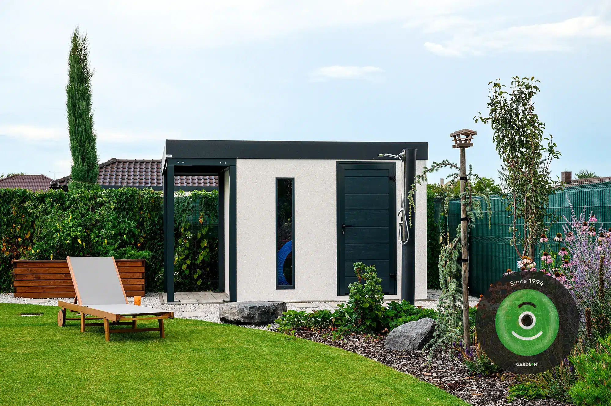 Bledě šedý zahradní domek s přístřeškem a antracitovou výplní